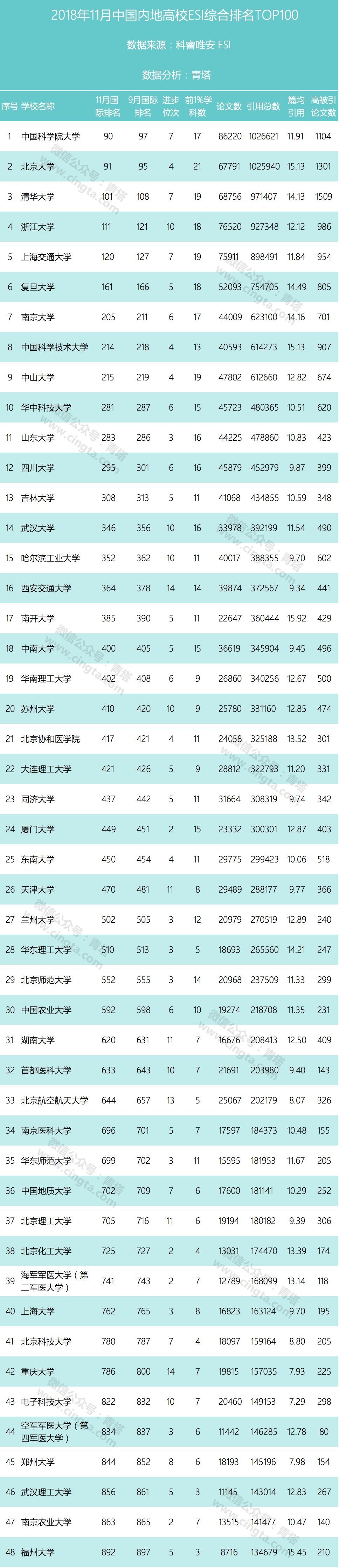 本期青塔整理了201811ESI最新数据中国内地高校综合排名前100名的数据,同时与20189月的排名情况进行了比较,一起来看一看。